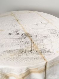 Auf einem ungewöhnlichen Medium skizzierten die beiden Architekten im Berliner Hotel am Zoo „zum Entsetzen des Oberkellners“ ihre Vorstellungen zum städtebaulichen Wettbewerb „Hauptstadt Berlin“.
