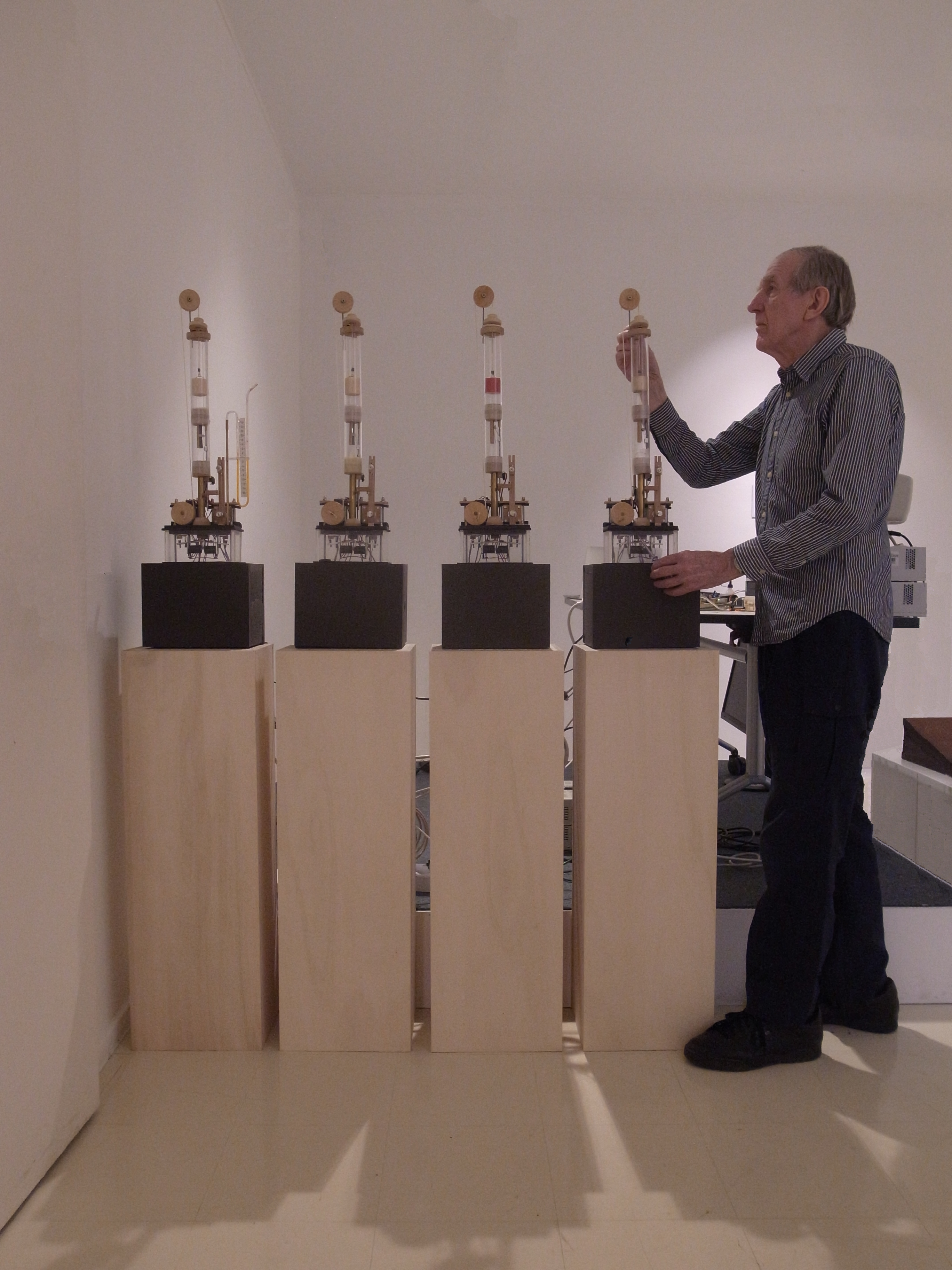 Four Voices follows my previous acoustic voice synthesis projects: Talking Machine (1989–1991) and MotorMouth (1994–1999). Four Voices is closely based on my Singing Machine (2010–2013), a single transparent vox humana pipe with a mechanised reed and a range of one octave. The machine sings in much the same way as a human being: with air, a moving “tongue”, and “lips” which enable it to sing vowel sounds. The mechanism is clearly visible and there are no loudspeakers. In 2013–2017, the Singing Machine performed hitonokiesari, composed for it by Masahiro Miwa, and based on a specially commissioned poem by Sadakazu Fujii.